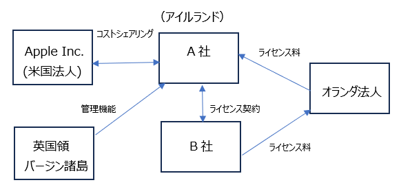 アイルランドは法人の居住地をその法人の管理支配地によって決定する。A社はその管理支配地を英国領バージン諸島に置くことで、アイルランドで非居住者扱いとなり受け取るライセンス料が非課税となる。また、A社はコストシェアリング契約で得た無形資産の権利をB社にライセンス供与することにより、B社無形資産から生み出される利益を米国以外の全世界から受け取ることができる。これに対してA社に対して支払われるライセンス料を控除した差額についてのみアイルランドの低税率(12.5%)によって課税される。また、B社からA社へのライセンス料の支払いにオランダ法人を介在させることで、当時の税制によればB社からオランダ法人への支払いは、アイルランド・オランダ租税条約で免税になり、オランダ法人からA社への支払いはオランダ国内法によって免税となる。このような形でApple社は米国以外から受け取る巨額のIT関連収益を1%未満という非常に低い実効税率の課税だけで済ませていた。